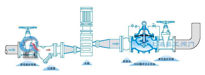 當300X緩閉止回閥從入口端給水時,水通過微型過濾器、針閥、單向閥進入主閥控制室,再經過球閥排水至下游。因為針閥開度小于球閥開度,即主閥控制室的排水速度大于進水速度,因此控制室壓力減少,作用于主閥盤下端的入口壓力打開主閥向下游供水。